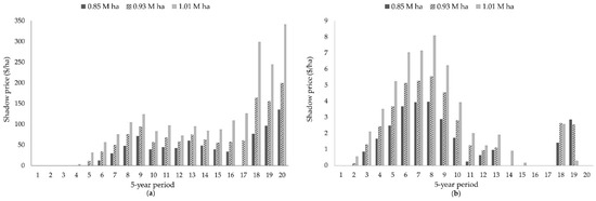 Shadow prices for the aspen harvest constraints follow the same pattern across all the scenarios considered in this subsection. Values increase from zero or close to zero in periods one and two, to peak in period eight. Values in this period vary across target levels, reaching almost double for the 1.01 million hectare target than for the 0.85 million hectare target (Figure 8b). For these scenarios we can also see how the aspen shadow prices slightly increase at the end of the planning horizon, encouraging aspen harvest to be postponed for later periods.