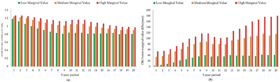 Old forest flows and their marginal values follow a different trend across scenarios (Figure 9). For the low marginal value function alternative, old forest area starts in period one with its maximum value, 1.18 million hectares, and with a very low marginal value associated with it, close to zero. The area of old forest in that scenario decreases over time until period nine. When the old forest area is slightly decreasing, the associated marginal values must increase, due to the definition of the downward-sloping function used to value old forest: the scarcer the service is, the higher the marginal value given to the service. This is also aligned with what we see in Figure 9b between period one and nine. From period nine to the end of the planning horizon, both the area of old forest and its marginal value remain approximately constant over time.