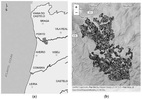 Figure 1). The maximum elevation reaches about 700 m, yearly average temperatures range between 10 °C and 15 °C, and the main soil types are anthrosols, leptosols, and regosols. It spans three counties (Castelo de Paiva, Penafiel, and Paredes), covering an area of about 14,388 ha, and it is classified into 1976 stands for forest management purposes. The area is dominated by pure eucalypt (