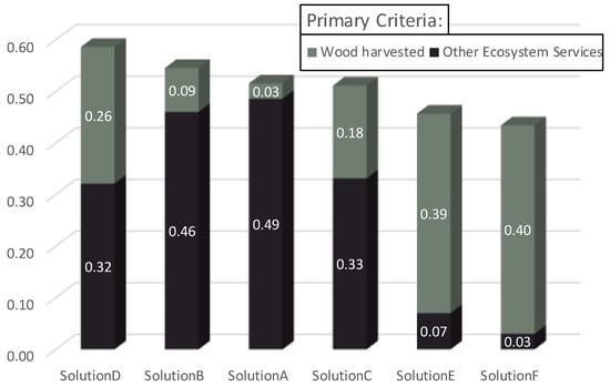 Figure 3); next, an aspatial MCDA analysis with CDP was conducted to assess the aggregate performance of Pareto solutions A–F over all stands for the 90-year planning horizon with respect to delivery of ecosystem services (