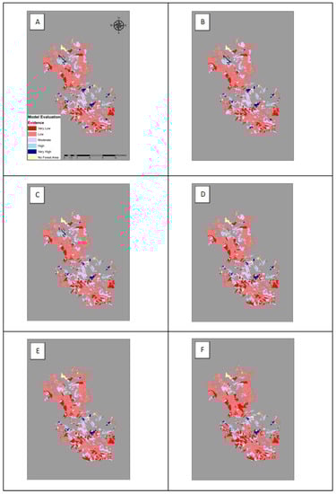 In the final step of the analysis, we used the weights developed in the second analytical step in a logic model that was executed by the NetWeaver component of EMDS to assess performance of the delivery of ecosystem services at the scale of individual stands. Each of the six nondominated points from the Pareto solution was associated with a map that was evaluated in EMDS, because the input data vary with the Pareto point selected. The NetWeaver model is structurally and computationally equivalent to the CDP model, but the key NetWeaver metric is a measure of strength of evidence. In this application, the topmost logic topic in the model was evaluating evidence that a particular Pareto solution delivers ecosystem services in a stand. One map of NetWeaver outcomes was generated in EMDS for each Pareto point. Maps are symbolized in terms of degree of evidence that the solution delivers ecosystem services. This analysis disaggregated the strategic MCDA analysis to individual stands.