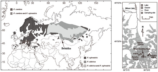 Location of the Belukha glacier in Russia’s Altai Republic, and distributions of extant P. cembra and two Pinus species (P. sibirica and P. sylvestris) found in the region surrounding the glacier. The sampling site was located on the western side of Mt. Belukha. The distribution map was compiled based on the maps of Farjon [22]. The figure is from our previous study [10].