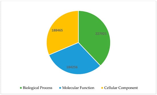 In total, 600,642 Gene Ontology (GO) terms were mapped to the A. marmelos leaf contigs belonging to all the three possible classes, i.e., biological process (227,921 transcripts), cellular component (188,465 transcripts), and molecular function (184,25 transcripts) in the GO database (Figure 1). The breakdown of the proteins associated with the various biological process, cellular components, and molecular functions is illustrated in Figure 2. The “integral component of membrane” (GO: 0016021) associated with various cellular components, “transcription DNA-templated” (GO: 00006351) associated with biological processes and “ATP binding” (GO: 00005524) associated with molecular function were the most mapped terms in their respective categories (Figure 2.).