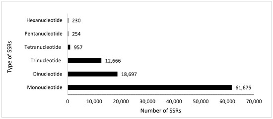 Simple sequence repeats (SSRs), or short tandem repeats or microsatellites, are short repeat motifs that show length polymorphism due to the insertion or deletion mutations of one or more repeat types [51]. We analyzed for the abundance of SSRs of annotated plant transcripts for A. marmelos leaf transcripts using the MISA tool, and the predicted SSRs statistics are shown in Figure 3. There were 58,354 transcripts that contained SSRs, and among these, 23,034 had more than one SSRs (Table S4). In total, 94,479 SSRs were identified, of which 65.27% were monorepeats, 19.78% were direpeats, and 13.40% were trirepeats (Figure 3). Tetra, penta and hexarepeats made up 1.01%, 0.26% and 0.24% of the total, respectively (Figure 3). However, out of a total of 94,479 identified SSRs, 11,400 (12.06%) were related to the compound formation.