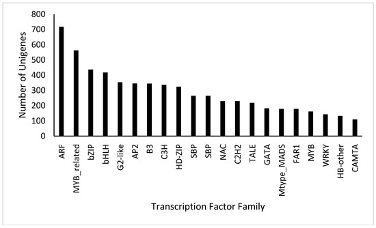 Gene expression patterns are regulated by transcription factors that in turn determine the different biological process [54]. A total of 7002 transcription factors were retrieved from the PlnTFDB. The 52 transcription factors were unique to the A. marmelos leaves; although these were out of a total 6122 that were extant above 100 in the unigenes (Table S5). The most abundant were Auxin response factors (ARFs) (717), myeloblastosis (MYB-related) (562), a basic domain/leucine zipper (bZIP) (437), and basic helix–loop–helix (bHLH) (417), whereas HB-Other (132) and CAMATA (109) were the least abundant (Figure 4).