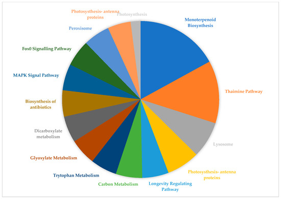 A. marmelos leaves are used for the treatment of several medical conditions in Ayurveda and Yunani medicine systems [65]. The transcripts with the highest fragments per kilobase per million mapped reads (FPKM) values were extracted from an annotation file along with the Kyoto Encyclopedia of Genes and Genomes (KEGG) ID and sorted from the RNA-Seq by Expectation Maximization (RSEM) file that was obtained from the assembly for transcript quantification. Using the KEGG ID, pathways were identified (Table S10). RSEM is commonly used to obtain information regarding transcript abundance from the RNA-Seq data of an organism, even without a reference genome [66]. The pathway analysis identified that monoterpenoid biosynthesis and thiamine pathways were the two most expressed pathways present in the A. marmelos leaves (Figure 5).