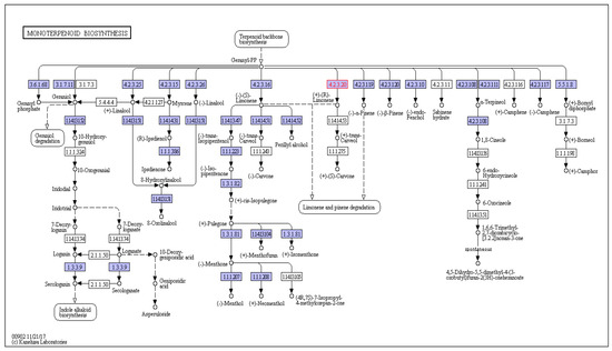 A. marmelos leaf transcriptome encoded enzymes (highlighted) involved in the monoterpenoid biosynthetic pathway identified in the leaf.