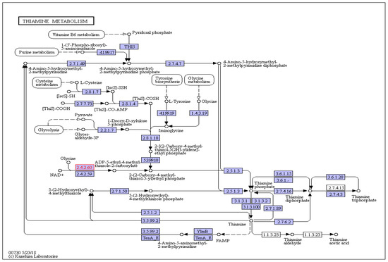 A. marmelos leaves have been reported to contain monoterpenoids as the principal metabolites in the leaves in levels as high as 93.9% [67,68]. Moreover, this monoterpenoid content is not affected by the geographic location of the plant, as it remains unaffected by changes in altitude, unlike many other metabolites [69]. Thiamine is naturally produced in the plants as a sulfur-comprising and water-soluble compound. A. marmelos contains thiamine, although thiamine concentration is higher in the fruits than the leaves, and is among the fruits with the highest thiamine content [70,71]. Detailed information regarding the routes, reactions, and encoded enzymes of the two most expressed pathways identified in the leaf transcriptome of A. marmelos is provided in Figure 6 and Figure 7. This detailed information generated regarding the monoterpenoid and thiamine biosynthetic pathway will be useful for further genetic analysis of the production of these important metabolites and their pathway engineering.