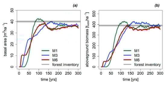 For forests in the late successional-phase, the obtained basal area are nearly equivalent for all of the three parameterization versions (M1: 36.5 m2 ha−1, M3: 37.2 m2 ha−1, M6: 35.3 m2 ha−1; Figure 1a and Table 4) and match nearly the value observed in the field data (40 m2 ha−1). However, the forest in M1 reaches this level of basal area 50 years earlier than the forest in M6 and M3. A similar trend was obtained for aboveground biomass (Figure 1b, Table 4, Figure A1). All simulated forests reach the same level of aboveground biomass in the late-successional phase (360–400 t ha−1), which is comparable to the observed field data (390 t ha−1). Again, M6 and M3 required 50 years more to reach this biomass level. Forest succession is predicted to be slower in the parameterization versions with higher functional diversity (M3, M6). In late successional phase, the simulated stem size distribution matches well the distribution observed in the field (Figure A6).