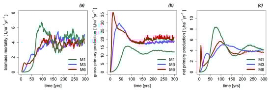 Biomass loss due to tree mortality (a), gross primary production (b), and net primary production (c) for simulated tropical forest (9 ha). Shown are the parameterization versions with different numbers of plant functional types (PFT): mean-species approach with one PFT (M1), a parameterization with three PFTs representing different light demands (M3), and the parameterization with six PFTs (M6) representing different light demands and height classes.