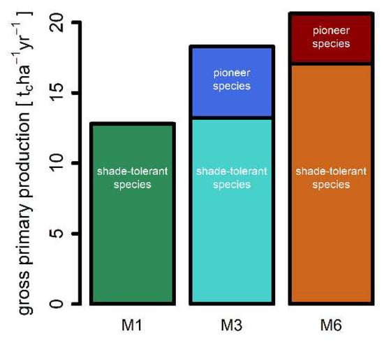 Gross primary productivity (GPP) estimates divergence for the different model parameterization versions (Figure 2b, Table 4). M6 shows 60% higher GPP values than M1 and M3 shows 42% higher GPP values than M1 during the late-successional phase. However, all forest simulations require approximately the same time (~150 years) to reach equilibrium phase. In addition, the variation (standard deviation over time) of GPP was three times larger in M6 than in M1, in M3 two times larger (Figure 2b). Differences are mainly caused by fast-growing and highly productive pioneer tree species that are missing in M1 (c.f., parameter Pmax in Table 3). These pioneer tree species are responsible for one-fifth of the GPP in M6 and one-third in M3 (Figure 3). Surprisingly, GPP of shade-tolerant species in M6 is 30% higher than in M1 and M3 (Figure 3 and Figure A4).