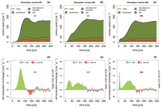 FORMIND simulates above- and belowground carbon stocks, and the total carbon balance of a forest, referred to as net ecosystem exchange (NEE, positive values indicate a carbon sink). All carbon stocks for the mature forest (including aboveground carbon, deadwood pool and soil pool) have value in all parameterization versions (Figure 4a–c). However, the accumulation time until equilibrium differs. While the deadwood and soil pools need 150 years to reach equilibrium in M6 and M3 (Figure 4b,c), these pools are empty for M1 within the first 50 years and then rapidly increase to the equilibrium phase within the next 50 years (Figure 4a). Please note that the dynamics of the deadwood and soil pools are closely related to mortality events of the forest, which are rare within the first 50 years for M1 (c.f., Figure 2a).