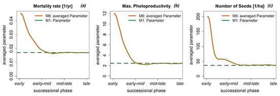 The parameter values for the processes mortality, photosynthesis and recruitment of M1 were compared with a dynamically averaged parameter of M6. Dynamically averaged parameters of M6 are calculated for each time step by averaging the six different parameter values for each PFT, weighted by the current simulated biomass fraction for each PFT. In the early successional phase, the forest is dominated by pioneer species, so the averaged parameter value for M6 is comparable to the parameter values of pioneer species. Therefore, it is evident that the averaged parameter of M6 differs significantly from M1 (Figure 5), especially before the early-successional phase (<100 years). Mean mortality rate of M6 is twice as high in this phase, maximum photoproductivity almost four times as high and number of seeds five times higher compared to M1 (Figure 5). From the mid-successional phase onwards (>100 years), the dynamically averaged parameters of M6 are similar to the values of M1. In this phase, the forest is dominated by climax species, which is comparable to the parameter values of the climax species, which resulted in a very similar parameter value of M1 and averaged parameter of M6.