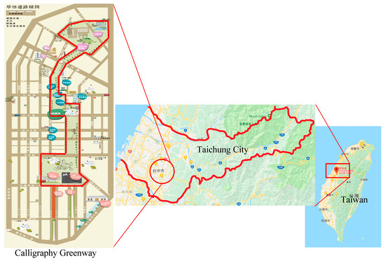 - Bai, H.-Z. Exploring the Charms of Taichung Calligraphy Greenway. Master’s Thesis, Tunghai University, Taichung, Taiwan, 2014. [Google Scholar]