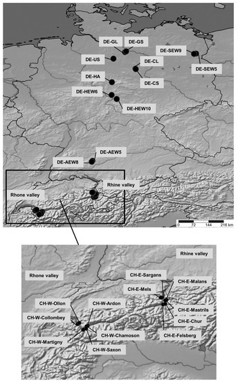 Mature beech populations located at 24 different sites ranging from northeast Germany to southwest Switzerland (Rhone valley and Rhine valley) and growing under different geographic and environmental conditions were studied (Figure 1, Table 1). For an easier assignment of populations to geographic locations in this study, the German populations were labeled with the prefix “DE” and the Swiss populations with the prefix “CH”. The Swiss populations were further labeled with “W” or “E” corresponding to their location in western (“W”) or eastern (“E”) Switzerland. The altitude ranged from 64 m a.s.l. (population DE-SEW5) to 800 m a.s.l. (populations CH-W-Ardon and CH-W-Chamoson). The mean annual temperatures (period 1961–1990) varied from 6.2 °C (population DE-HA) to 9.3 °C (populations CH-E-Malans, CH-E-Mastrils, CH-E-Sargans, and CH-E-Mels), and the mean annual precipitation (period 1961–1990) from 532.1 mm (populations DE-SEW5 and DE-SEW9) to 1326 mm (population DE-HA). The populations mainly represented pure beech stands, sometimes mixed with a few other tree species, such as oak. Three of the 24 populations (DE-AEW8, DE-SEW9, and DE-HEW10) are not under forest management anymore, because they are located in nature conservation areas. Climate data for the period 1961–1990 were obtained from climate stations located near these populations, and downloaded from the websites of the German Meteorological Service (Deutscher Wetterdienst) and the Federal Office of Meteorology and Climatology (MeteoSwiss). Based on the downloaded variables, three additional variables were calculated: Mean vegetation season temperature and precipitation during May to September, and the Ellenberg’s climatic quotient (EQ), which is used to describe the climatic limit for beech in Europe. Regions with an EQ value below 20 represent pure beech climates, while beech competitiveness slowly decreases in regions with EQ values between 20 and 30; beech disappears in regions with EQ > 30 [33]. The Ellenberg’s climatic quotient was calculated as follows [32,33]: