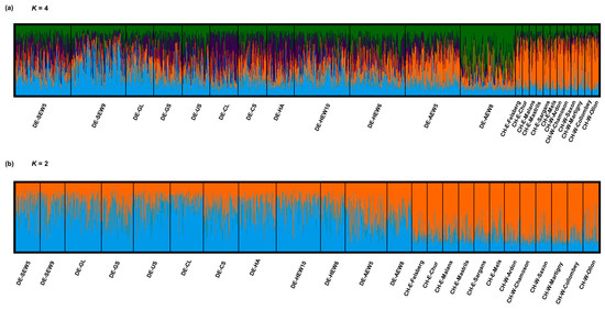 - Pritchard, J.K.; Stephens, M.; Donnelly, P. Inference of population structure using multilocus genotype data. Genetics 2000, 155, 945–959. [Google Scholar] [PubMed]