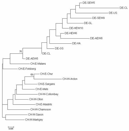 No deviations from neutral expectations for the SSR loci were detected in the outlier analysis. The STRUCTURE analysis for the adult populations revealed the most likely number of K = 4 based on the delta K method [56]. The clustering of individuals showed a tendency of decreasing genetic similarity of populations from northeast to southwest, but the population DE-AEW8 deviated from this pattern and seems to be an outlier (Figure 2a). The NJ dendrogram showed similar results. The German and Swiss populations grouped into two different clusters with high bootstrapping support for the German cluster (76%) with population DE-AEW5 in a basal position (Figure 3). However, most clusters in the dendrogram were not well-supported by bootstrapping values. A similar dendrogram was also obtained for the seedlings (Supplementary Material Figure S2). The STRUCTURE analysis for the seedlings revealed the most likely number of K = 2 (Supplementary Material Figure S3). The same trend was also observed for the seedlings: Similarity between populations is decreasing from northeast to southwest with most differences observed between German and Swiss populations (Figure 2b). The mean pairwise GST values were 0.017 among adult populations, 0.015 among seedlings, and 0.015 between adults and seedlings (Supplementary Material Table S7). Adult and seedling cohorts from the same population were not significantly differentiated or revealed very low differentiation values (mean pairwise GST = 0.002; Table 4).