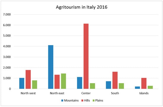 The distribution of agritourism in Italy shows a higher number in the central part of the country and on the mountains. These confirm that hilly areas and mountains, less developed than the plains but where we find most of the forests, have attractive landscapes. The small number of businesses in the south and the islands are mostly due to organizational problems of this sector, and these areas have usually a higher number of unique landscapes compared to the rest of the country.