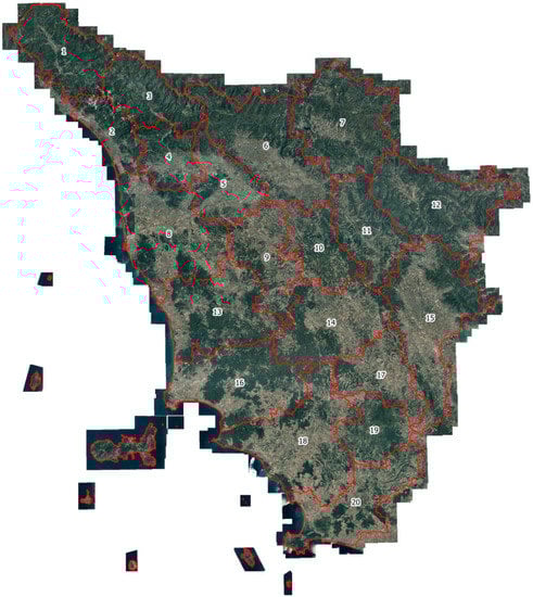 The 20 landscape units in which the territory of Tuscany has been divided according to the landscape plan. In the aerial photo forest areas are in dark green color. As it can be observed they are distributed all over the territory, especially on the Apennine mountains in the north, creating a complex landscape mosaic made of forest and agricultural patches.
