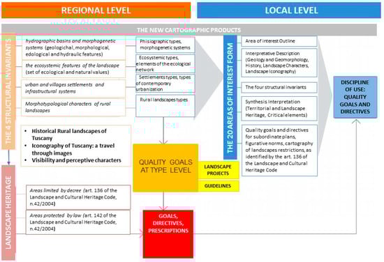 The landscape plan of Tuscany is an act required by the National Code for Cultural Heritage, that allows each region to develop a landscape plan independently from the ordinary territorial plans defined by urban planning, or to integrate them in one single plan. In the case of Tuscany, the regional council decided to integrate the two planning levels in one single act, the law n. 65 of 2015 “Norms for the Government of the Territory” []. The law aims at achieving sustainable development controlling the transformations induced by economic activities, fostering the maintenance, reuse, restoration and the creation of new landscapes. In the law, landscape capital has been considered a common good, recognizing equal rights to the citizens in terms of use and fruition, respecting their needs for a better quality of life for the present and future generations. Landscape capital is defined as the “whole set of structures resulting from the long-term coevolution between nature and human society and an important value for the future generations” []. An active conservation of landscape resources, together with the protection of the cultural and natural heritage of the region represent the general view of the plan.