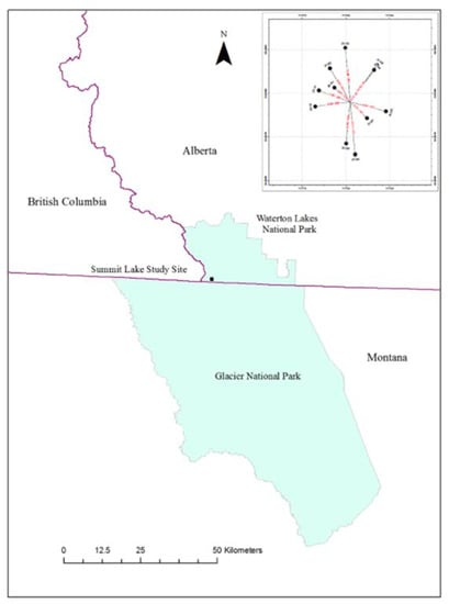 The study area is located near Summit Lake in Waterton Lakes National Park (WLNP), Alberta Canada (49°0′ N, 114°1′ W) (Figure 1) at elevations between 1950 m to 2000 m; the site is relatively flat. The climate is characterized by deep, persistent snow packs and short cool summers with average annual precipitation around 152 cm. The soil composition is an orthic humo-ferric podzol derived from glacial till and the texture is loam to gravelly loam with 10–70% coarse fragments. The overstory vegetation is mixed coniferous forest comprising of subalpine fir (Abies lasiocarpa (Hook.) Nutt.) and Engelmann spruce (Picea engelmannii Parry ex Engelm) with scattered whitebark pine. The understory vegetation consists mostly of thick mats of beargrass (Xerophyllum tenax (Pursh) Nutt.) with scattered huckleberry shrubs (Vaccinium membranaceum Douglas ex Torr.) [35]. White pine blister rust infection has caused a high level of mortality in mature whitebark pines at the site. Many of the naturally regenerating seedlings are dying from rust infection and competitive exclusion from the faster-growing, shade-tolerant conifers such as spruce and fir.
