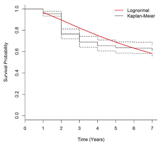 Survival of seedling clusters over seven years. Comparison of the log-normal model fit with the Kaplan-Meier curve. Dashed lines represent 95% confidence intervals.