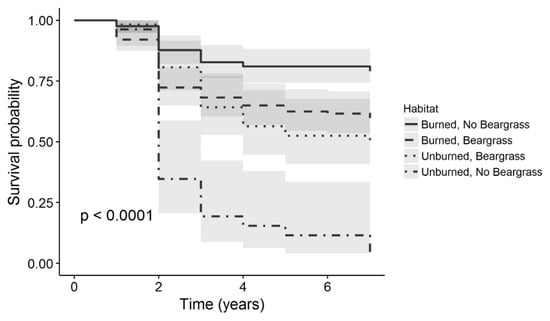 Cluster survival for four habitat treatment types: Burn and beargrass, burn and no beargrass, unburned and beargrass, and unburned and no beargrass (X2 (3, n = 331) = 64.8, p ˂ 0.0001) over seven years.