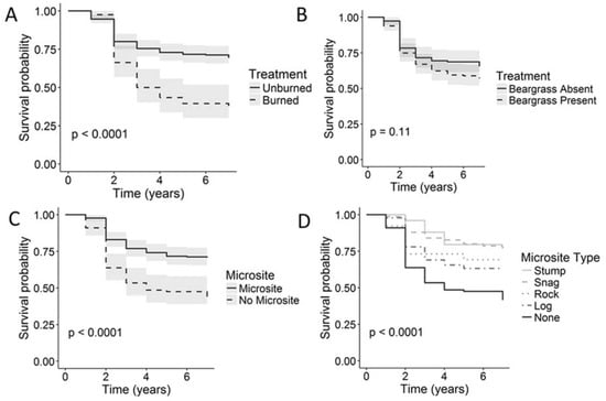Seedling cluster survival over time. (A). on burned and unburned areas X2 (1, n = 331) = 27, p ˂ 0.0001. (B). with and without beargrass X2 (1, n = 331) = 2.6, p = 0.11. (C). with and without microsite X2 (1, n = 331) = 27.4, p ˂0.0001. (D). famong microsite (shelter object) types X2 (3, n = 219) = 5.4, p =0.143, but is the same as C between “None” and “Present”.