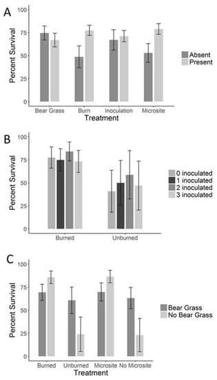 Survival of whitebark pine seedling clusters after seven years summarized for (A). individual variables: with and without beargrass X2 (1, n = 307) = 2.20, p = 0.14, with and without burning X2 (1, n = 307) = 22.75, p < 0.001, with and without inoculation X2 (1, n = 307) = 2.2, p = 0.14, with and without inoculation X2 (1, n = 307) = 0.49, p = 0.49, with and without a microsite X2 (1, n = 307) = 22.22, p < 0.0015. (B). with and without ectomycorrhizal inoculation of 1, 2, or 3 seedlings in each cluster on burned and unburned sites. For burned sites X2 (3, n = 231) = 2.27, p = 0.52, for unburned sites X2 (3, n = 76) = 1.26, p = 0.74. (C). burned with and without beargrass X2 (1, n = 231) = 8.85, p = 0.003, unburned with and without beargrass X2 (1, n = 76) = 9.09, p = 0.003, microsite present with and without beargrass X2 (1, n = 205) = 8.56, p = 0.003, microsite absent and without beargrass X2 (1, n = 102) = 12.49, p ˂ 0.001.