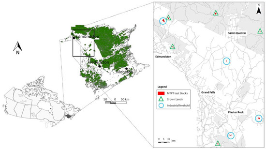 Location of the MTPT test sites located in Northwestern New Brunswick, Canada. Green color in the middle map indicates public-forest lands.