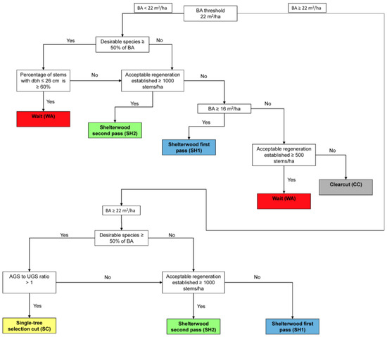 Silvicultural treatment decision key with criteria eligibility. The decision key was produced to meet the objectives of the MTPT project and should not be used outside this scope. BA = basal area; desirable species are sugar maple and yellow birch.
