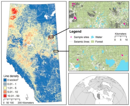 Map of the study area in northern Alberta, Canada. Seismic line density (per km2) in the left map, location of Alberta in bottom right, and locations of sample sites in two regions of northeast Alberta in the upper right (Fort McMurray area at top, Cold Lake area in middle).
