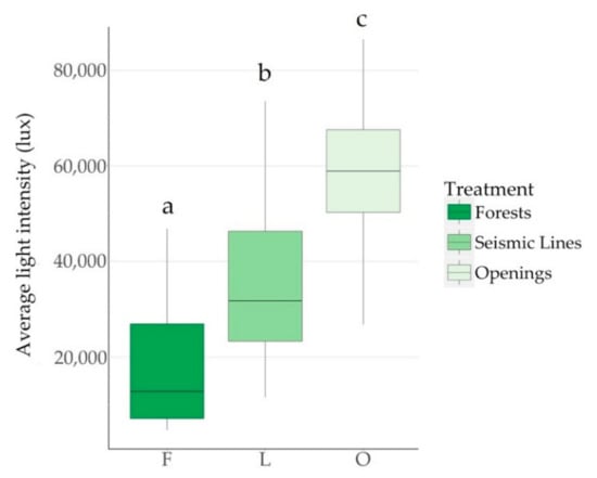 Box plot of average light intensity (lux) for forests (F), seismic lines (L), and openings (exploratory well pad sites) (O) for 46 sites in northeast Alberta, Canada. Post hoc Tukey tests were used to assess differences between groups with different letters signifying significant differences (p < 0.05).