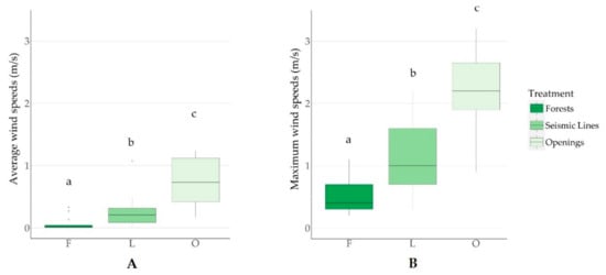 Boxplots of (A) average wind speed and (B) maximum wind speed in m/s for forests (F), seismic lines (L), and well pad openings (O) across 45 sites in northeast Alberta, Canada. Post hoc Tukey tests were used to assess differences between groups with different letters signifying significant differences (p < 0.05).