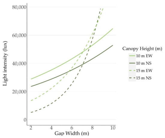 Predicted light intensity (Gamma log link) for the most supported model by gap width along either east-to-west (EW) or north-to-south (NS) orientated seismic lines under two canopy heights (10 m and 15 m).