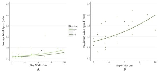 Scatterplots and GLMM model predictions of (A) average windspeed (m/s) by gap (line) width for either east-to-west (EW) or north-to-south (NS) orientated seismic lines; and (B) maximum windspeed by gap width.