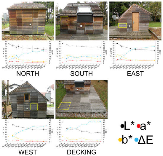 The total colour difference (ΔE from Equation (1)) after four years of weathering was the highest on decking and lowest on the south facing façade. Colour changes on the other three exposures (north, east, and west) were comparable. Furthermore, seasonal fluctuation in ΔE could be observed on all façades and decking, but mostly on the north facing façade and on the deck. The horizontal position is the most exposed to sun radiation, as well as to precipitation, which assured conditions for colour changes in abiotic and biotic ways, in particular the formation of a grey colour, as well as the sequential formation of UV-induced free radicals, the degradation of lignin into quinones, the leaching of quinones [20], and the development of staining fungi [38,46].