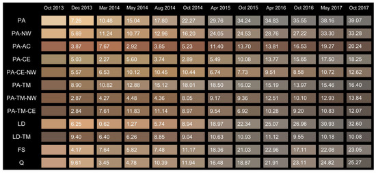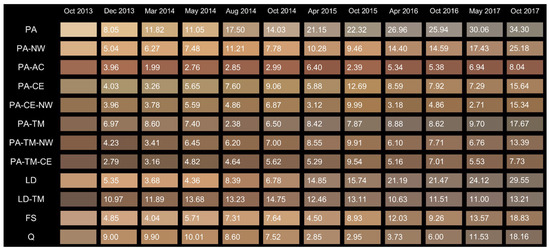 Figure 2, Figure 3, Figure 4, Figure 5 and Figure 6 show the averaged colour for each material and the calculated ΔE value (see Equation (1)), defined as the colour difference between the initial and the final stage. In general, the biggest colour difference was observed on the decking, with one exception, the thermally modified European larch (LD-TM), for which the ΔE was lowest on decking compared to other exposures. In addition, colour changes of thermally modified Norway spruce (PA-TM) on decking were not the most prominent; on the east and west façade, the colour difference was more notable. Generally, there was no correlation between which orientation of façade resulted in lower or higher colour changes. The prime reason for this was that the micro-positions of each material on respective façades differed, hence introducing an additional level of uncertainty. If individual materials were compared, it can be concluded that the lowest ΔE was observed on PA-TM-CE (copper-treated thermally-modified Norway spruce), followed by LD-TM (thermally-modified European larch) and PA-CE (copper-treated Norway spruce), and on the other side, the highest ΔE was measured on Norway spruce (PA), followed by wax treated Norway spruce (PA-NW) and European larch (LD). The modifications in wood structure occurring at high temperature were accompanied by several favourable changes in physical structure, i.e., enhanced weather resistance and a decorative, dark colour [47,48]. Values for ΣΔE (see Equation (2)) indicated that the course of the colour changes was fairly similar for all the exposure directions. One of the reasons for these observed differences originated in the initial colour. Norway spruce (PA), wax-treated Norway spruce (PA-NW), and European larch (LD) were lightly-coloured materials, so the development of the dark pigmented blue stain fungi was the most notable. On the other hand, the presence of fungicides (copper-based wood preservatives) prevented the development of the blue stain fungi (Table 2), whilst the presence of copper slowed down UV-induced degradation to a certain extent [49], which resulted in less noticeable colour differences (PA-CE and PA-TM-CE in Figure 2, Figure 3, Figure 4, Figure 5 and Figure 6).