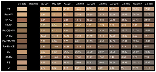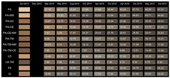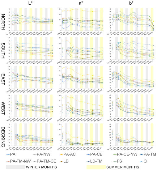 The most important reason for seasonal fluctuations was related to fungal melanin; with its formation on one hand being countered by bleaching on the other. During the wet autumn and winter months, blue stain fungi grew on the surface (Table 2). In the summer months, melanin was at least partially bleached [31], which resulted in fluctuations of lightness (in the autumn and winter the wood gets darker and in summer it turns back to lighter colours) (Figure 1). The extent of discolouration depended on microclimate conditions, the susceptibility of the material, UV radiation, etc. The rate of change of the two chromatic components, a* and b* values, decreased over time for north, east, and west façade exposure and was close to zero, meaning that samples were close to being achromatic, i.e., grey, which was also clearly evident from their visual appearances. Values of parameter a* on Norway spruce samples (PA) exposed on the east façade dropped beneath 0 in October 2015, which meant that the chromatic value changed from “red” to “green”. However, after October 2015, values were positive again.