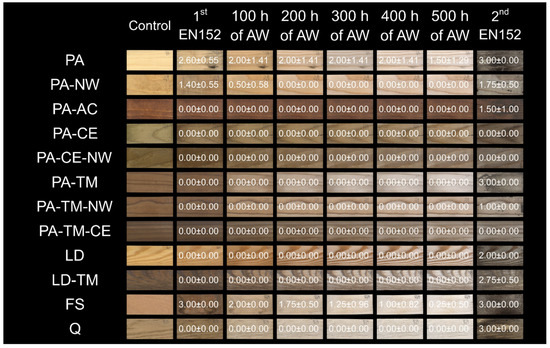In the third part of the laboratory trial, EN 152 [42] was performed again on weathered wood samples and more prominent colour changes were noted for all exposed specimens, as shown in Figure 9. The greatest colour change was measured for Norway spruce (PA; 52.3 ± 2.6) and European larch (LD; 35.4 ± 3.6). It is obvious that artificial weathering makes the surface more susceptible to fungal disfigurement. There are several explanations for this phenomenon. Firstly, UV radiation and spraying degrade and leach coloured secondary metabolites from the surface. In addition, partial degradation of lignin and cellulose occurred, which made them more susceptible to fungal infestation. Average ΔE among all specimens after first exposure to blue-staining fungi was 13.3, while average ΔE after second exposure was considerably higher, at 20.2. This can be explained by the ability of A. pullulans to utilise products of lignocellulosic photo-degradation, due to the ability of the fungus to use lignin-breakdown products as a sole carbon and energy source [59,60]. In addition, grades of visual assessment also increased significantly. After the second exposure, three materials remained non-discoloured, namely: copper-treated Norway spruce (PA-CE), copper- and wax-treated Norway spruce (PA-CE-NW), and thermally-modified copper-treated Norway spruce (PA-TM-CE), all of which were impregnated with a copper-based preservative. This observation is in line with the in-service testing presented in Section 3.1. This indicates that only biocides can limit fungal discolouration after severe weathering.