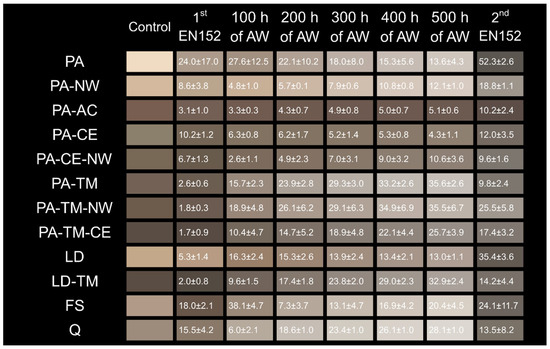An artificial weathering test (AW) between two EN 152 [42] tests was performed in a solar simulation chamber (Suntest XXL+, Atlas Material Testing Technology, Linsengericht, Germany). The climatic test chamber for solar simulation is equipped with three 1700 W xenon lamps emitting light with wavelengths between 300 and 420 nm. The standard EN 16474-1test [44] was followed to reproduce the artificial radiation in outdoor conditions. The exposure experiment was performed at a black standard temperature (BST) of 63 °C and an irradiance of approximately 0.35 W m−2 (340 nm) with daylight filters, and with a total cycle time of 2 h, composed of a 102 min dry cycle at 40%–60% relative humidity and an 18 min wet cycle with water spray. The colour of the specimens was measured every 100 h for the total duration of 500 h of artificial weathering. Every period, the uppermost side was visually evaluated and scanned.