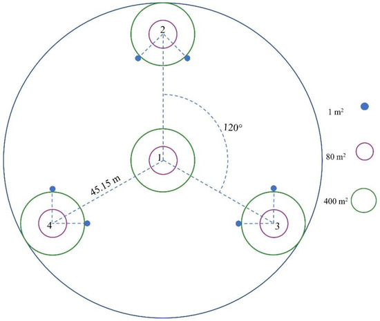 Plot design used for forest measurement. Plot design is composed of four grouped circular subplots. Subplot 1 is the center of the cluster, with the other three plots located 45.15 m away at azimuths of 360°, 120°, and 240°, respectively. Understory biomass was sampled at 1 m2 microplots, tress with DBH ≤ 2.5 were sampled in a central circular plot of 80 m2, and trees with DBH ≥ 5 cm were measured in the circular plot of 400 m2. 1 m2 microplots are not to scale.
