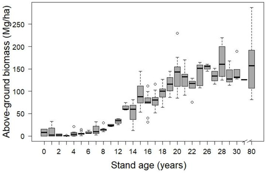 Additionally, we assumed the stand age based on the years after harvesting; however, the first successional stage of managed forest could last for several years, and forest structure variables related to age (i.e., basal area) may not represent the real stand age since some large scattered trees are left after harvesting due to the used regeneration method. Although useful, the lack of continuous spatial coverage of the predictors themselves (i.e., stand age) is a problem when one is attempting to use interpolation methods to spatially predict AGB. Therefore, it makes sense to use forest structure variables to better predict stand age in managed forest across larger areas in order to reduce AGB uncertainties.
