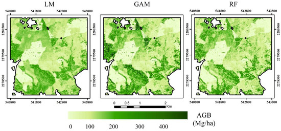 Spatial variability of AGB (Mg ha−1) by LM (Linear Model), GAM (Generalized Additive Model), and RF (Random Forest) at the managed forest landscape in the Zacualtipán forested region (3 × 3 km area). Developed areas and areas without forest vegetation were excluded.