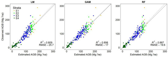 Observed versus model predictions data for plot-level AGB resulting from models of LM (Linear Model), GAM (Generalized Additive Model), and RF (Random Forest) for the managed forests in the Zacualtipán forested region. Solid lines represent the 1:1 line and dotted lines represent the slope. R2 and RMSE values were derived from 10-fold cross-validation as the measure of the model performances. Strata represent the age class of the forest stand (E1 = 80 years, E2 = 25–31 years, E3 = 14–22 years, E4 = 0–13 years).