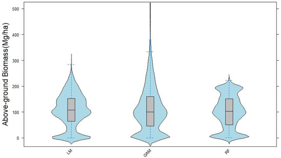 Predicted AGB across the managed forest landscape in the Zacualtipán forested region by LM (Linear Model), GAM (Generalized Additive Model), and RF (Random Forest) models. The width of the plot shows the distribution’s density of estimated AGB across the landscape, highly concentrated around the median.