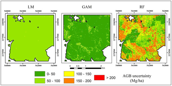Distribution of AGB uncertainty (Mg ha−1) by LM (Linear Model), GAM (Generalized Additive Model), and RF (Random Forest) at the managed forest landscape in the Zacualtipán forested region (3 × 3 km area).