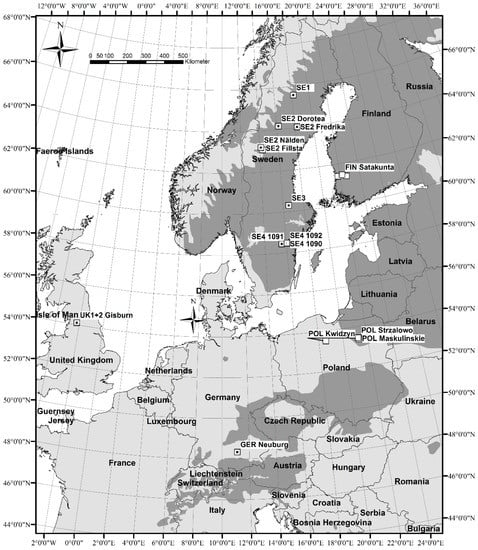 Table 2 summarizes the experimental design that varied between the studies. The experiments UK1, UK2, SE1, SE2, SE3, SE4, and FIN were designed as randomized block experiments to study the effect of one factor (the forest type—in our case, pine, spruce, and mixed pine-spruce) on stand growth. However, no monospecific spruce forest was included on two of the three sites of SE4, because pure spruce did not occur on these sites. The number of study sites and replicated treatments can be seen in Table 2. In SE1 and SE3, subplots within each 35 × 40 m study plot for the replicated treatments were established [17,18]. UK1, UK2, and FIN contained three replicates of each treatment at each study site. POL included four replicated treatments of monospecific pine and mixed forest on the site Maskulinskie, but there was no replication at other sites in Poland or Germany. Also, the selection of plots for each treatment was not randomized in the studies POL and GER.