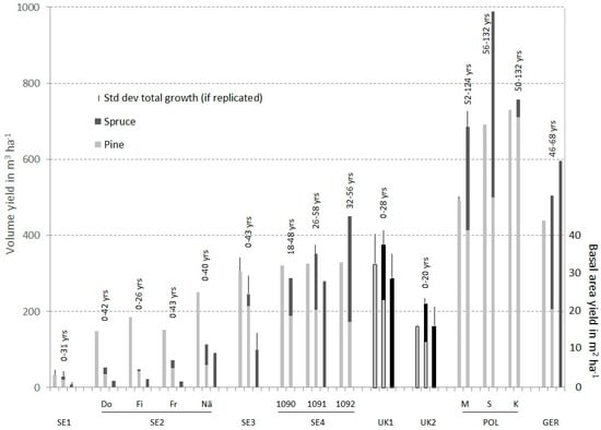 Cumulative production from the first to last measurements of the experimental sites (volume growth for SE, POL, GER in grey bar color, or basal area growth in UK with black color or contour). The three bars per study site illustrate the production achieved in the three different treatments: pine (left bar in light grey), tree species mixture (center), and spruce (third bar to the right, if available on the site). The lines above the bars indicate the standard deviation if the treatment was replicated on the site (see number of observations in Table 1). The numbers above the bars show the stand age covered by the observations.