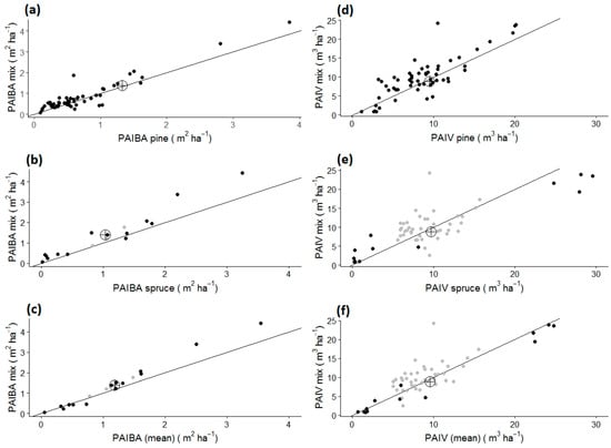 Periodic annual increment of basal area and standing volume (PAIBA and PAIV) in mixed tree species and pure stands of the experiments during different measurement periods: (a,d) mixed stand and pine, (b,e) mixed stand and spruce, and (c,f) mixed stand and the mean of both monocultures. The larger circle with the cross illustrates the mean of all observed increment values. Grey color indicates values where growth of pure spruce was estimated.
